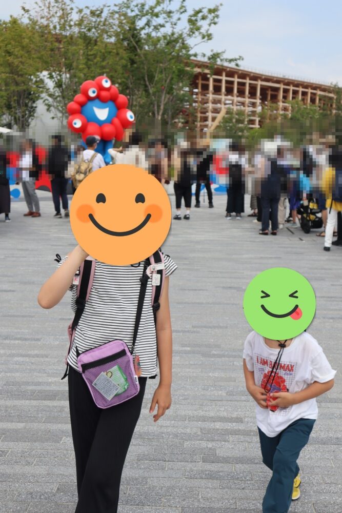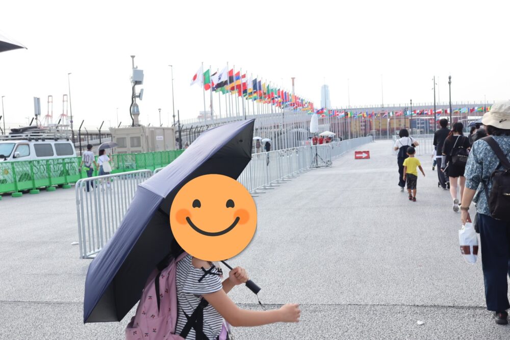 新大阪からラッシュアワーの御堂筋線→中央線で急いで会場まで向かいましたが夢洲着が8時25分で9時入場の待機列にはすでに多くの人が並んでいました。完全に出遅れました…。その日の大阪は最高気温36度の猛暑日で午前中でもすでに気温が高く、日傘をさしていても暑さで子どもたちはバテ気味でした。